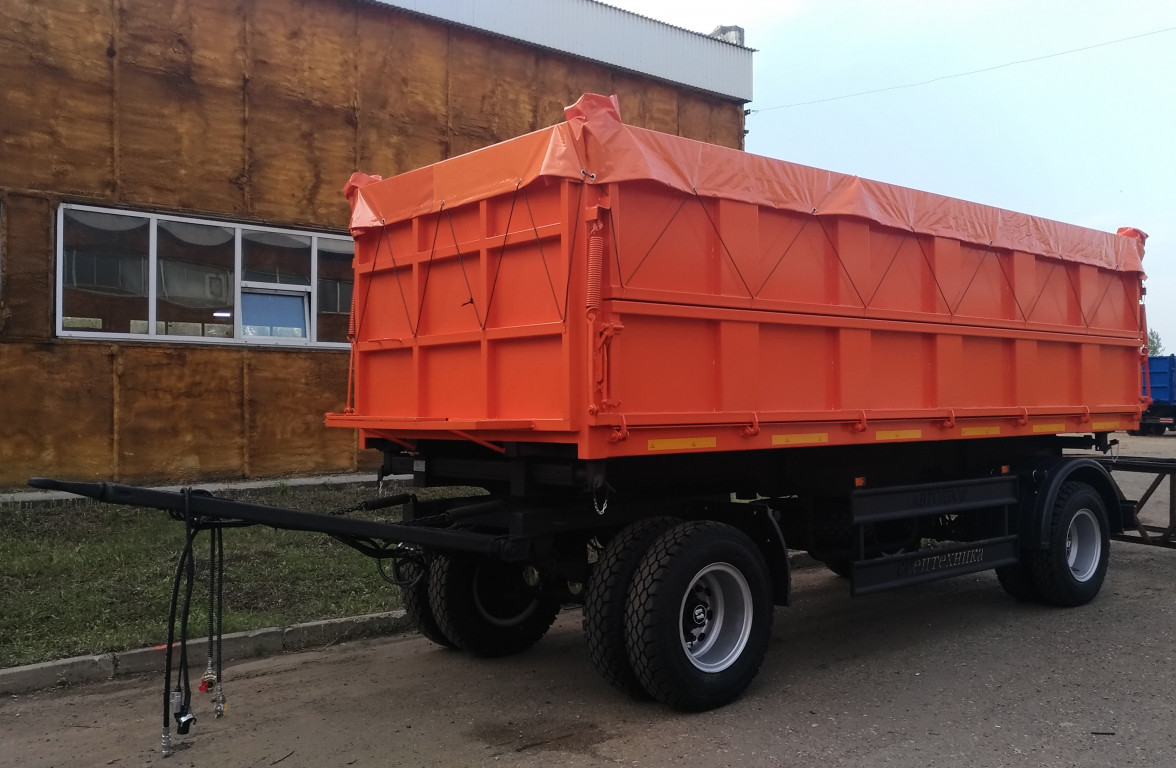 Самосвал бортовой, ручное запирание бортов, верхний ряд боковых бортов подвижный с верхней навеской, нижний ряд бортов подвижный с нижней навеской.Средней стойки нет, две опоры, один гидроцилиндр (по выбору). Пол стальной.